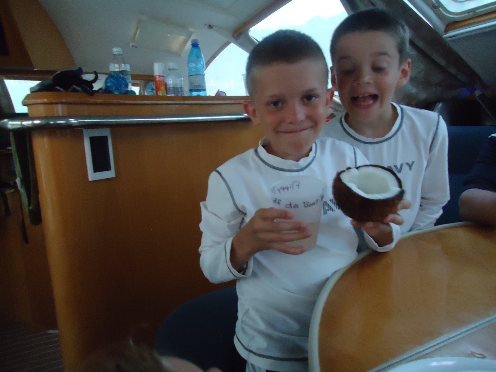 We grilled chicken on the barbecue, and then opened the coconut Scott found yesterday on Sandy Cay. The kids were fascinated by the process of opening the coconut. We swam it in to shore where we found a large, sharp rock. We smashed the coconut on the sharp edge to pierce the husk. Then, pulling on the husk, ripped it apart and pulled the coconut out of the center. We brought the coconut and a fist-sized flat rock back to the boat so we could smack open the coconut at the dinner table. Once opened, the kids spent half an hour picking the coconut meat out for dessert. We all agreed that if necessary, we could live off coconuts here for some time.
